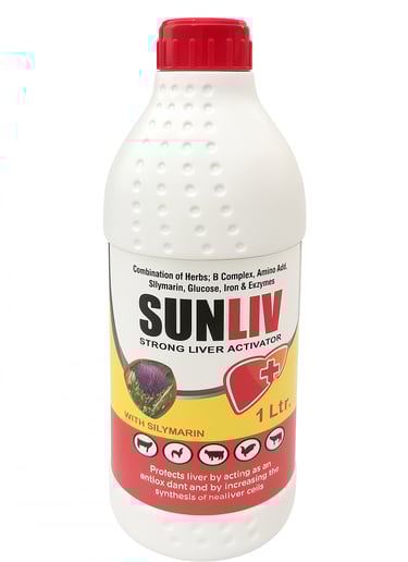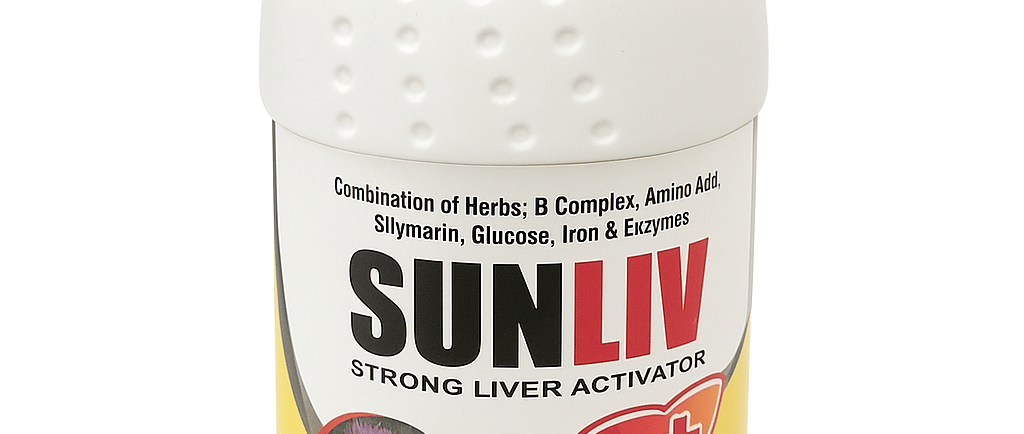 SUNLIV by Sunshine Pharma is a strong liver activator for cattle, poultry, and other livestock. Enriched with Silymarin, herbs, and B-complex, it protects the liver, improves digestion, enhances milk yield, and boosts animal health naturally.